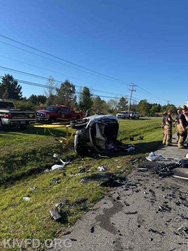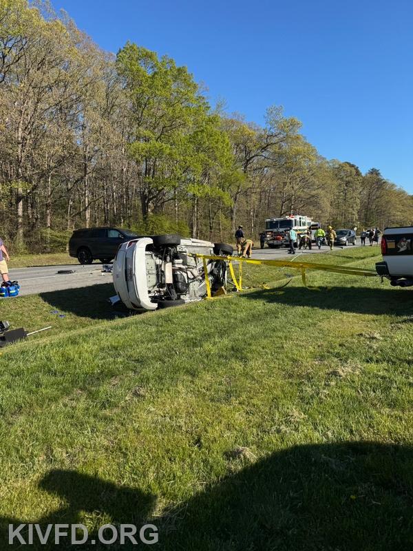 On April 11 at 1640 hours, Kent Island was alerted to a MVC with Entrapment on Route 8 at Laird Benton Road in the 9-7 Box. Station 1 responded and assisted United Communities (Station 9) with stabilizing the vehicle and extricating the single occupant from a vehicle on its side.